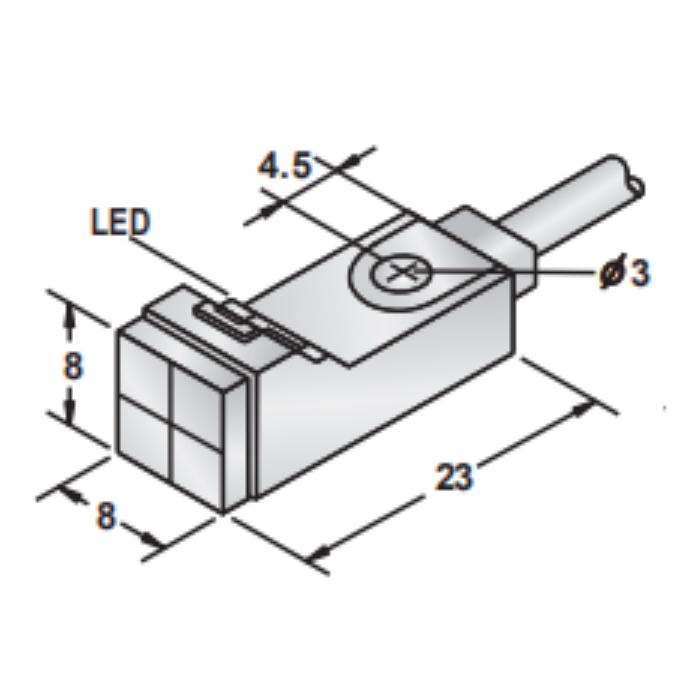 Индуктивный бесконтактный датчик серии LK08, прямоугольный, рабочая зона с торца, 10…30 VDC, PNP NO, Sn=2,5 мм.