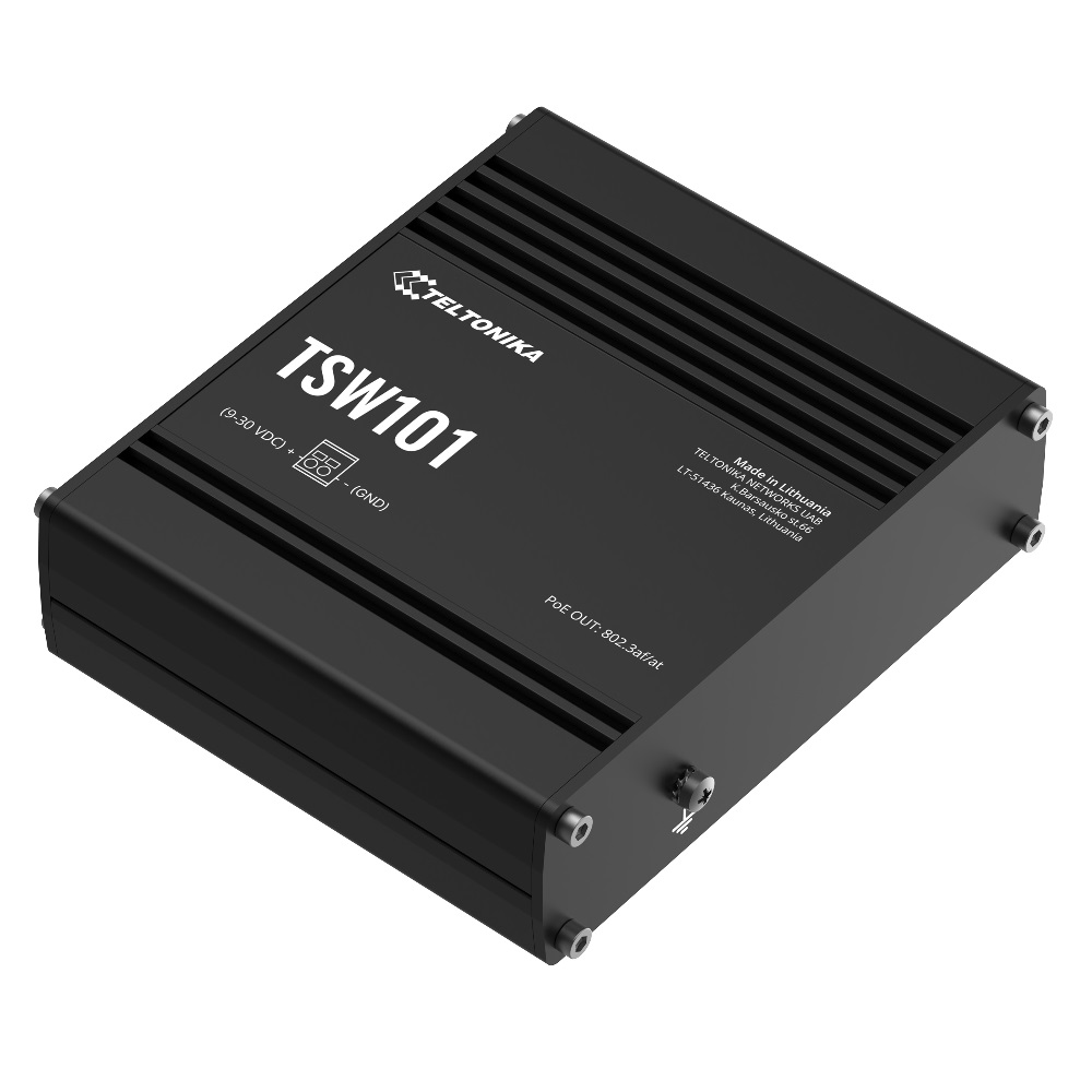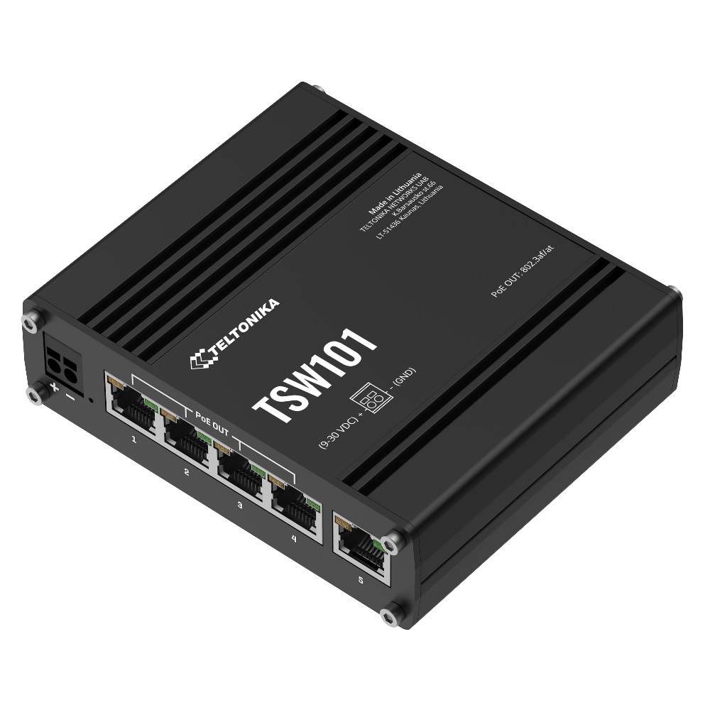 TSW101 is a robust industrial grade switch with 5x Gigabit Ethernet ports, 4 of which can be used to power connected devices via PoE 802.3af/802.3at standards, and a 2-pin power socket for automotive applications.
