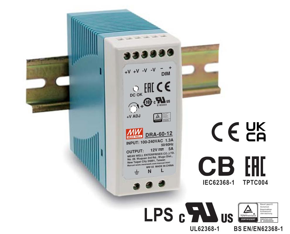 DRA-60-12 — это AC/DC преобразователь мощностью 60Вт для монтажа на DIN-рейку. Устройство оснащено функцией Io programmable, позволяющей дистанционно изменять уровень стабилизации выходного тока в диапазоне от 10% до 100% от номинала (0.5А – 5А).